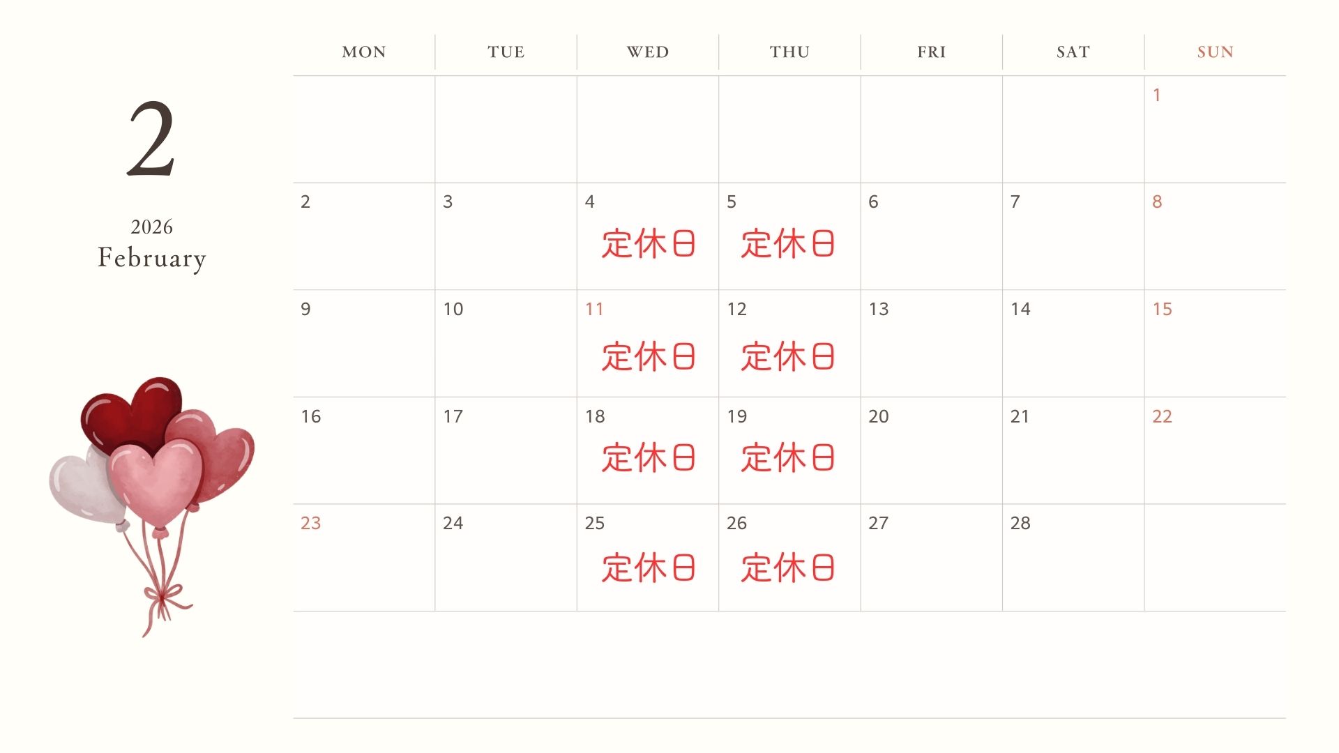 秋保木の家ロッジ村 2026年2月休業日のお知らせ 2026 1/30 お知らせ 平素より木の家をご愛顧いただき、誠にありがとうございます。当館は下記を休業日とさせていただきます。 毎週水曜日・木曜日ご不便をおかけして大変申し訳ございませんがご理解いただきますようお願い申し上げます。 お知らせ よかったらシェアしてね! URLをコピーしました! URLをコピーしました!